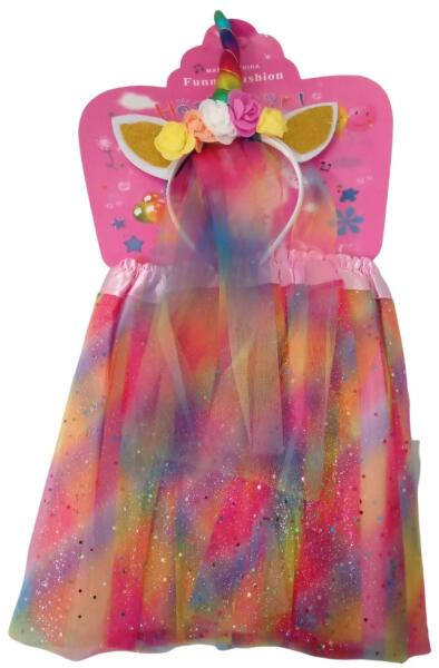 Unikornis farsangi jelmez, csillogó tüll szoknyával.